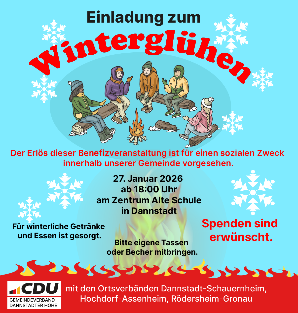 Der CDU-Gemeindeverband lädt Sie ganz herzlich zum diesjährigen Winterglühen ein. Mit dieser Benefizveranstaltung übernehmen wir gezielt soziale Verantwortung. Der Erlös ist für einen sozialen Zweck in unserer Gemeinde vorgesehen.